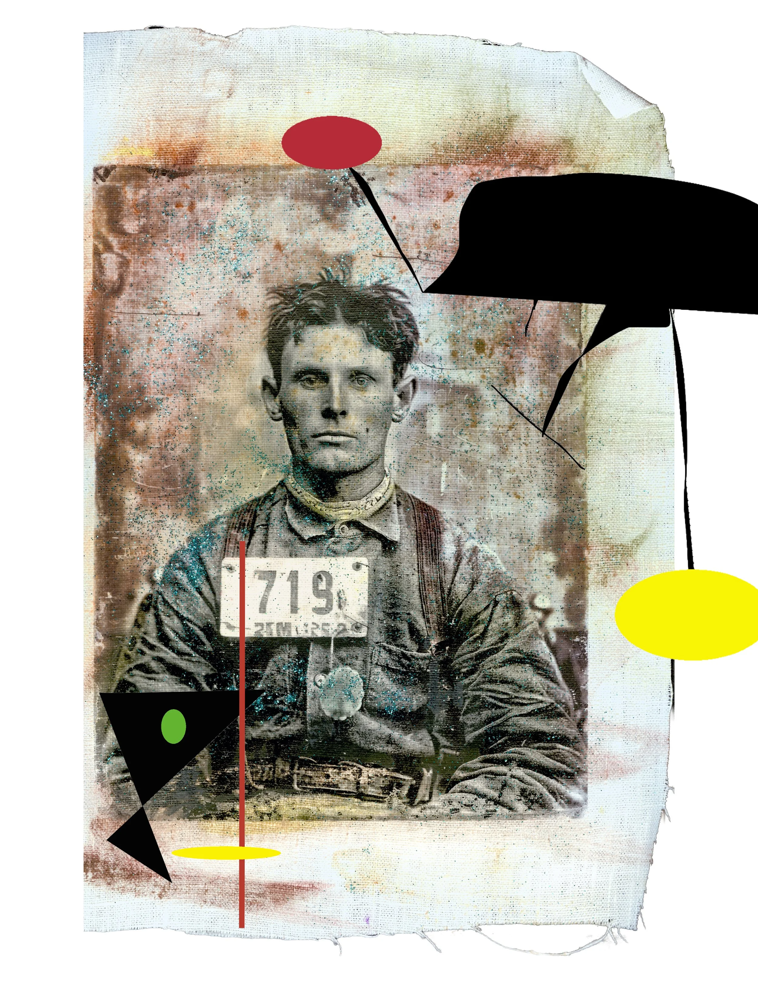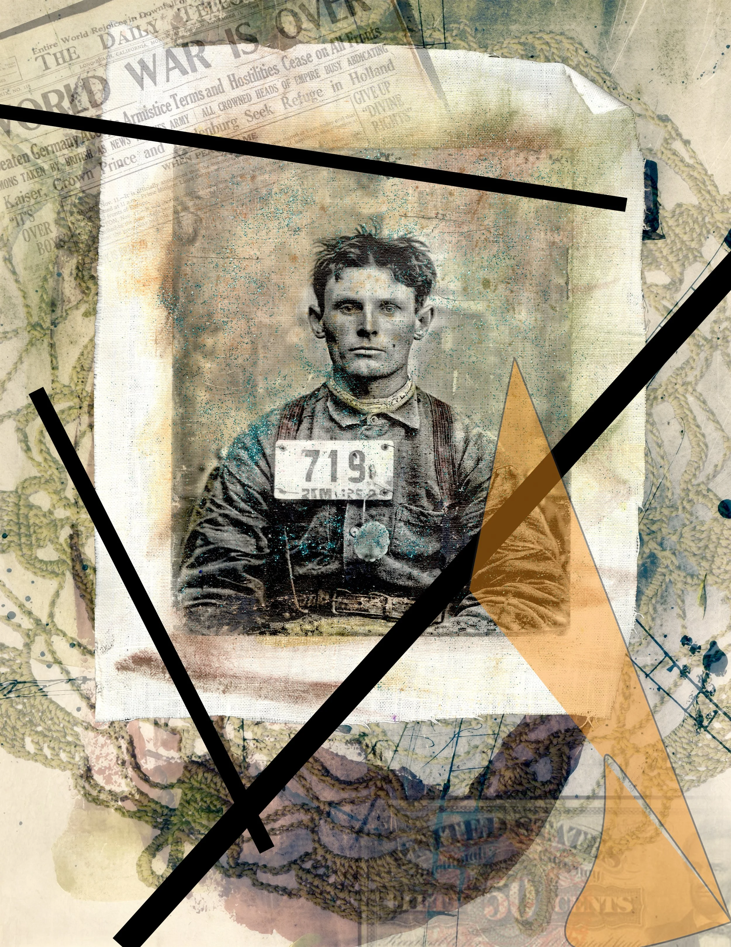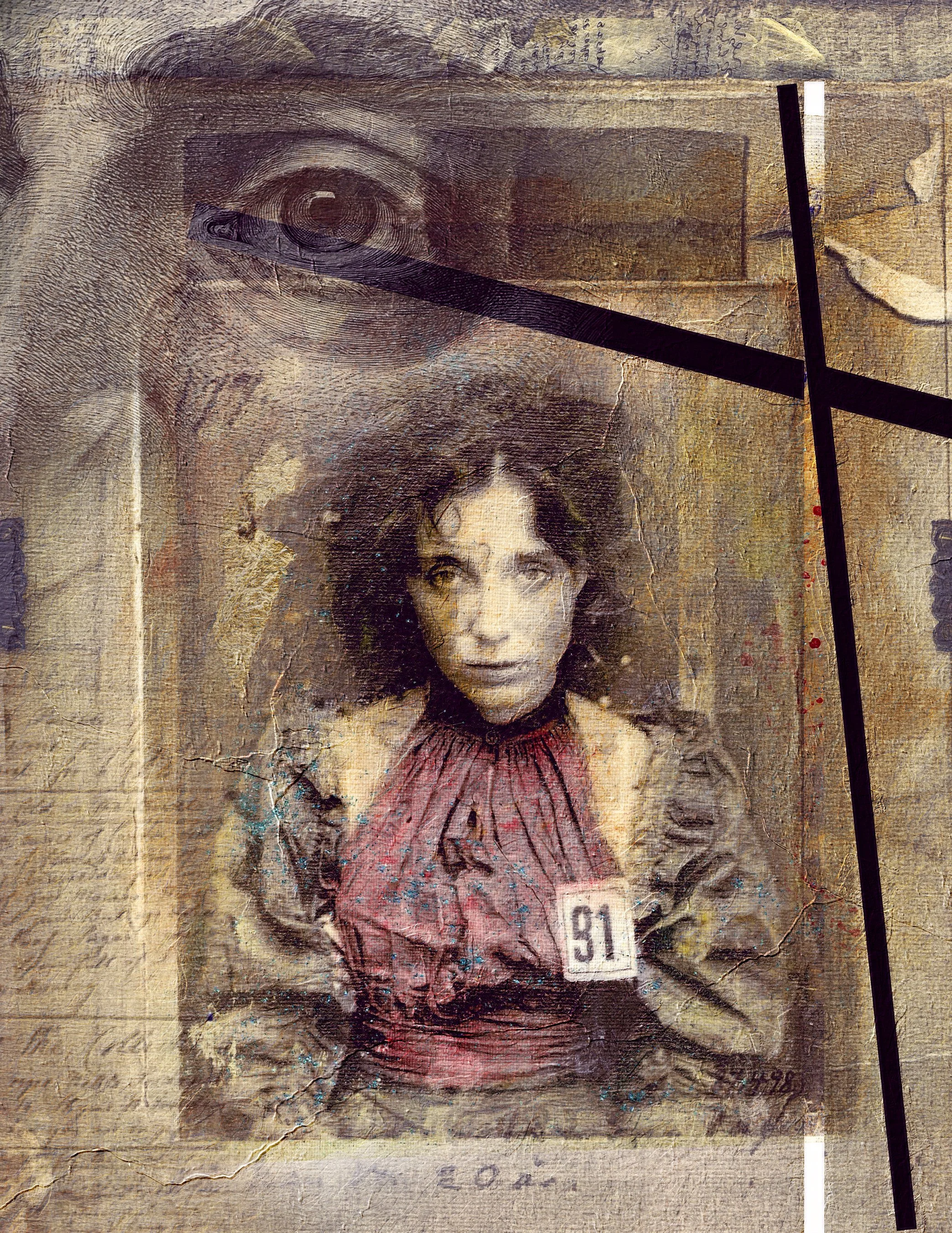 These pieces originated as vintage black and white photos. The photos were transferred to linen fabric and then hand-colored. Finally, the fabric pieces were scanned and processed another time to create the collages you see in front of you.