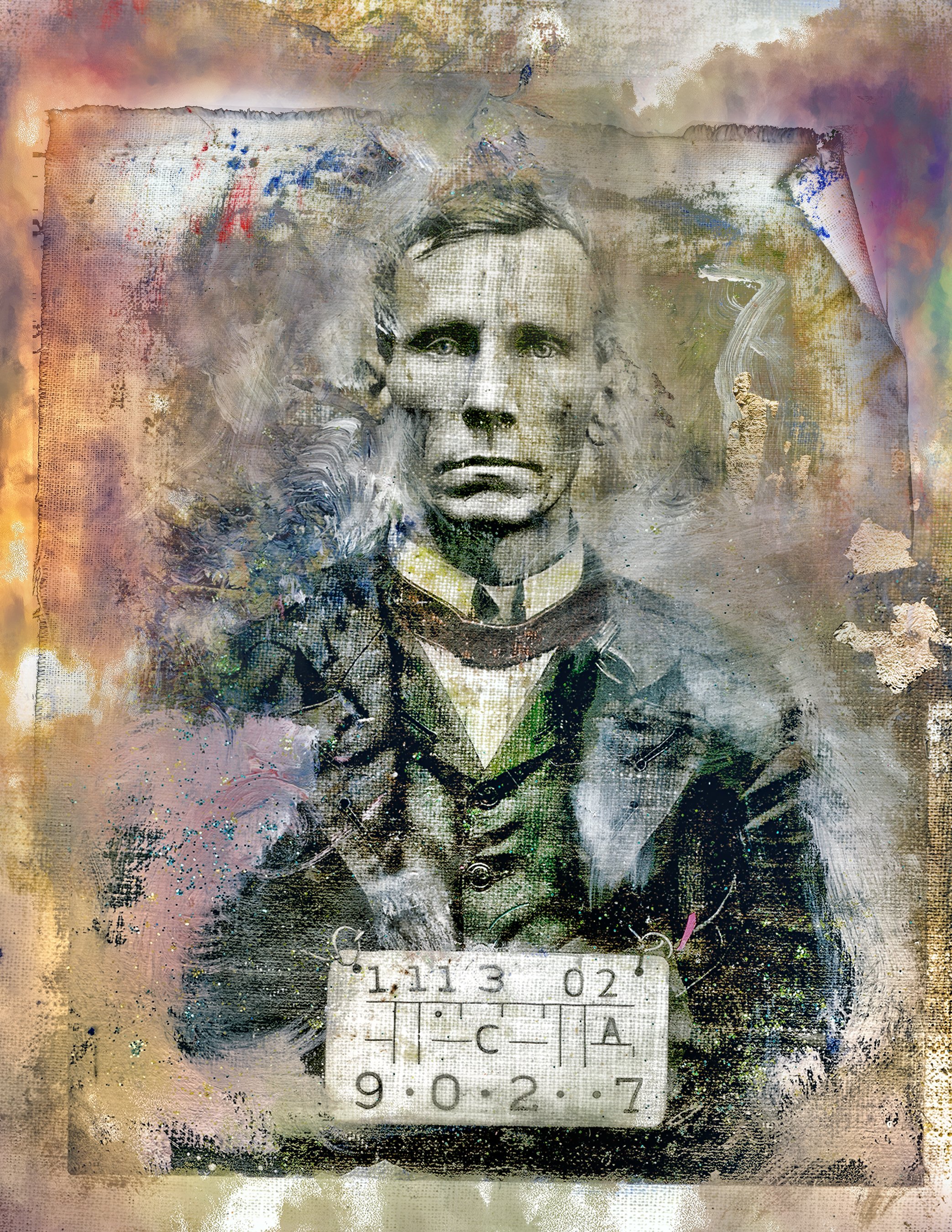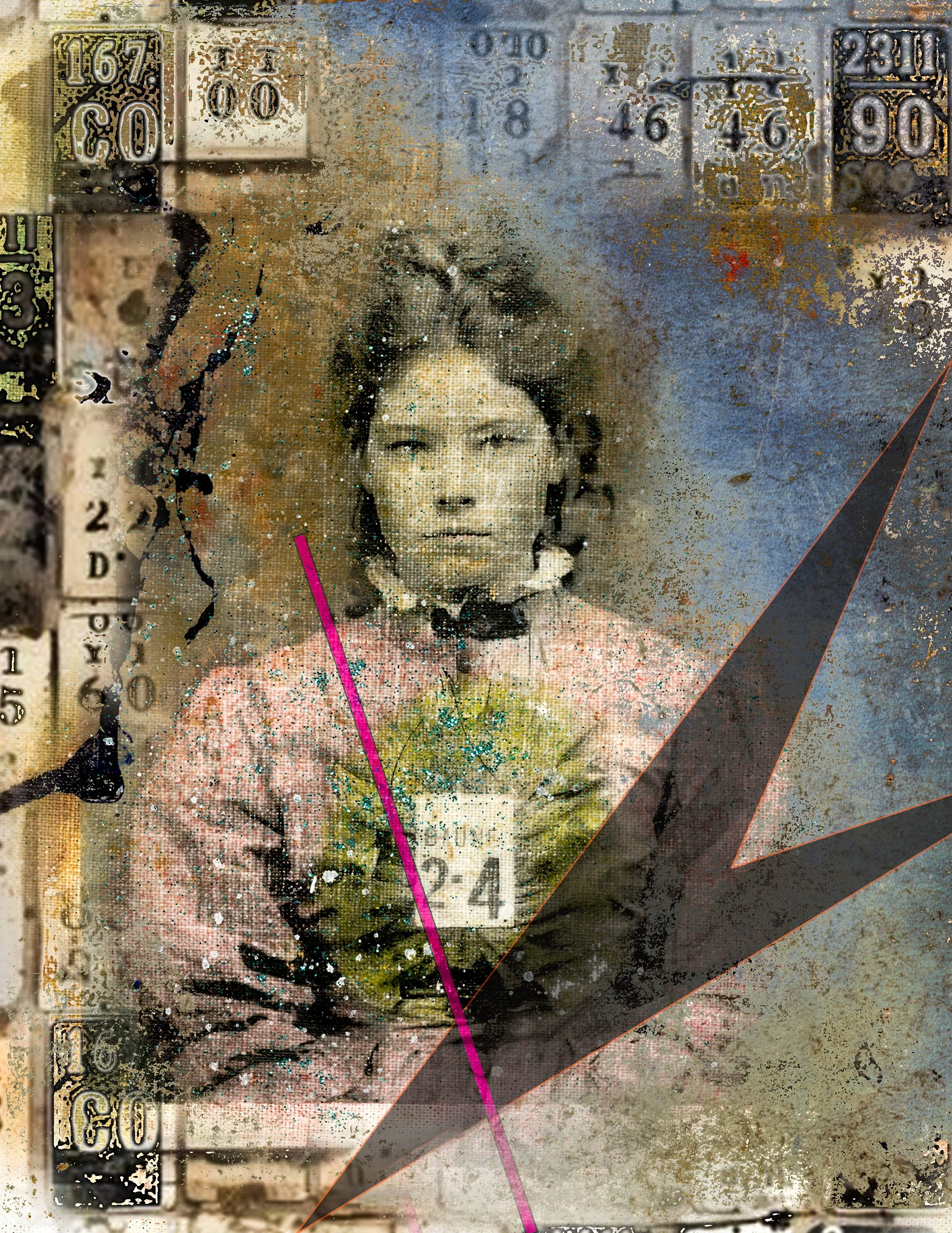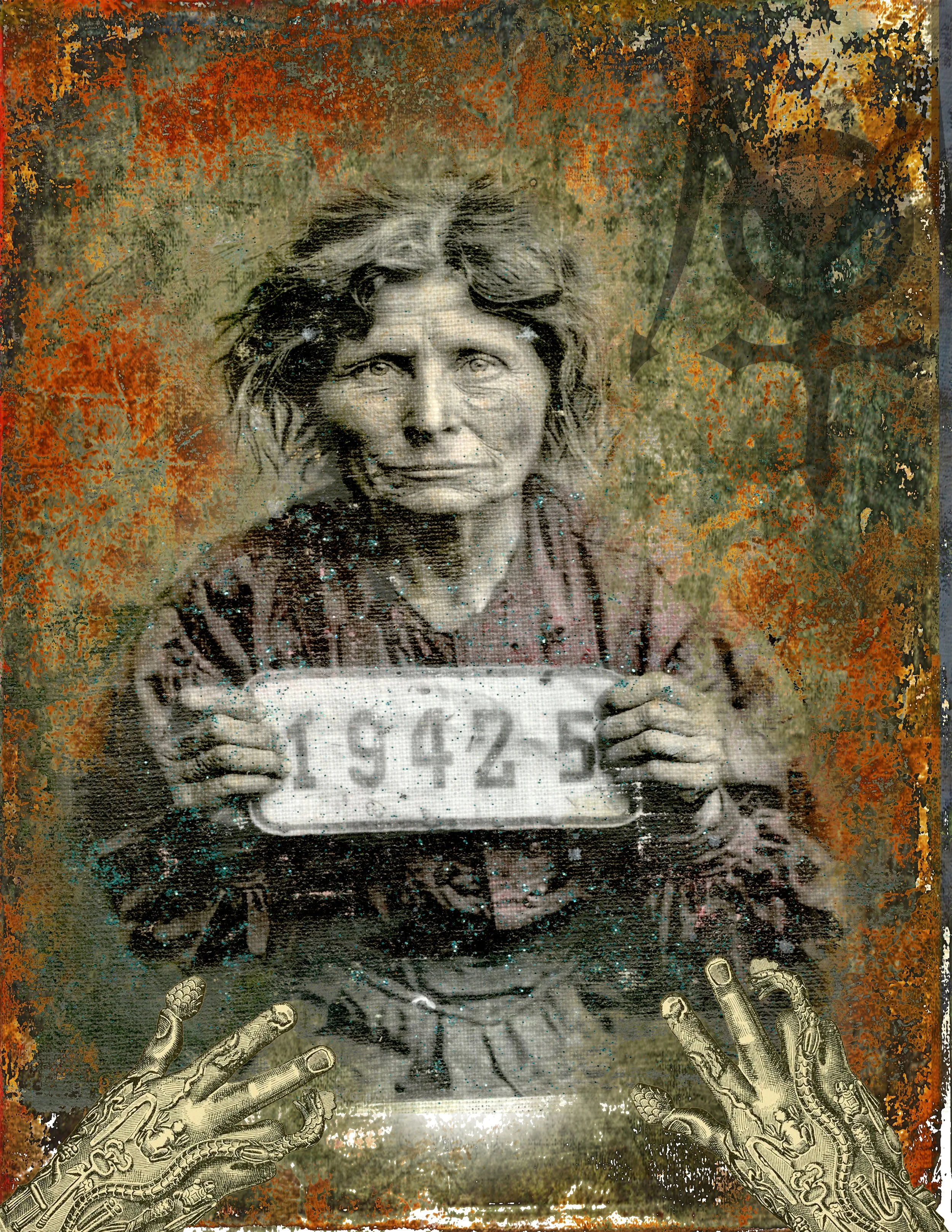 These pieces originated as vintage black and white photos. The photos were transferred to linen fabric and then hand-colored. Finally, the fabric pieces were scanned and processed another time to create the collages you see in front of you.